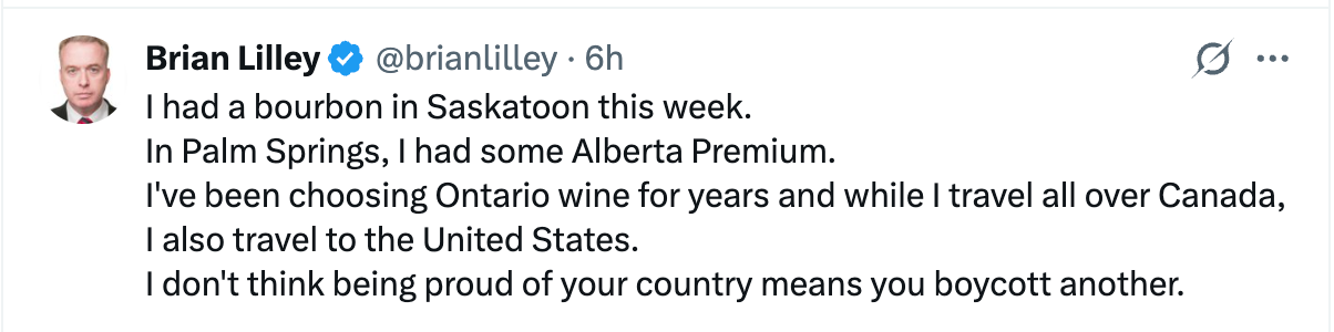 That doesn’t mean I didn’t pay attention. I heard Mark Carney say that the plane load of Canadians flying back with me on Saturday were bad Canadians for heading south. Oh, and we shouldn’t drink bourbon or California wine.