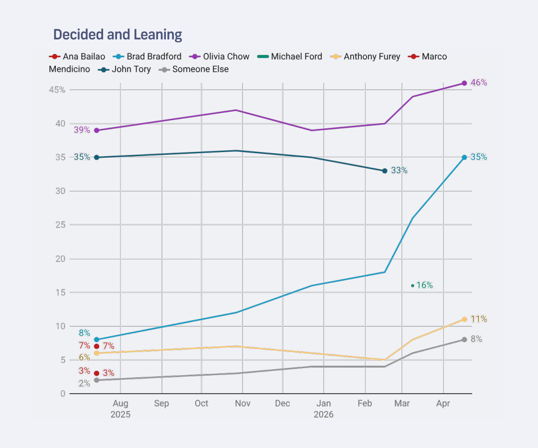 Jodi Shanoff at JS Insights shows Chow in the lead with 37%, Bradford at 36% and 27% undecided. Among those who say they will definitely vote in the next election, 41% say they will back Chow and 39% say they would support Bradford with 20% undecided.