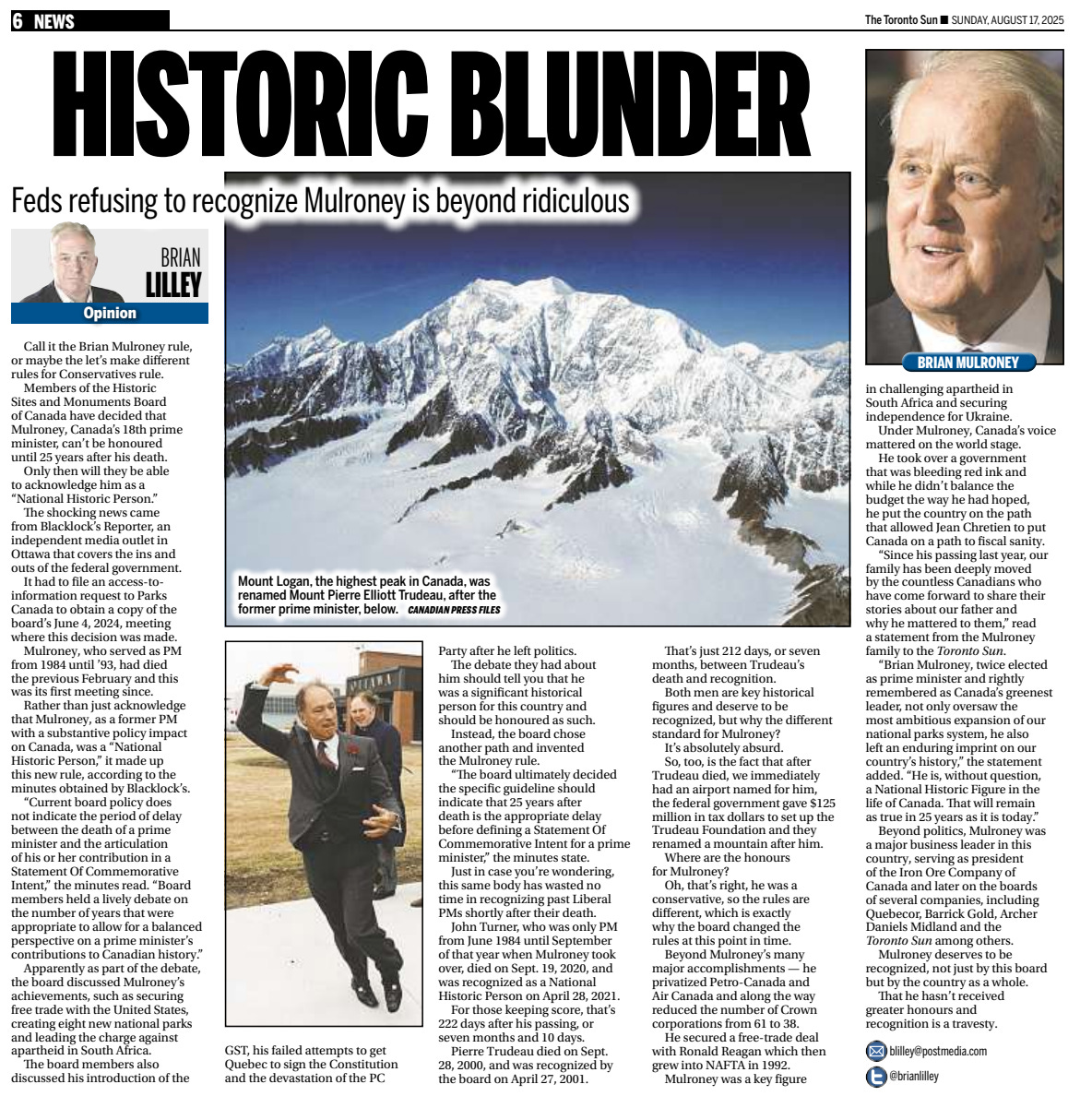 You may have heard over the weekend that the Historic Sites and Monuments Board of Canada have decided that Brian Mulroney can’t be recognized as a “National Historic Person” until 25 years after his death, meaning 2049.