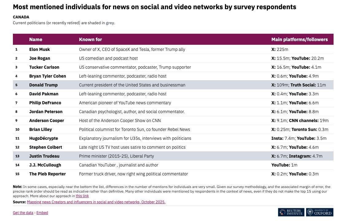In a study by Oxford University and the Reuters Institute, I was listed as one of the people most mentioned by Canadians for influencing news and public commentary.