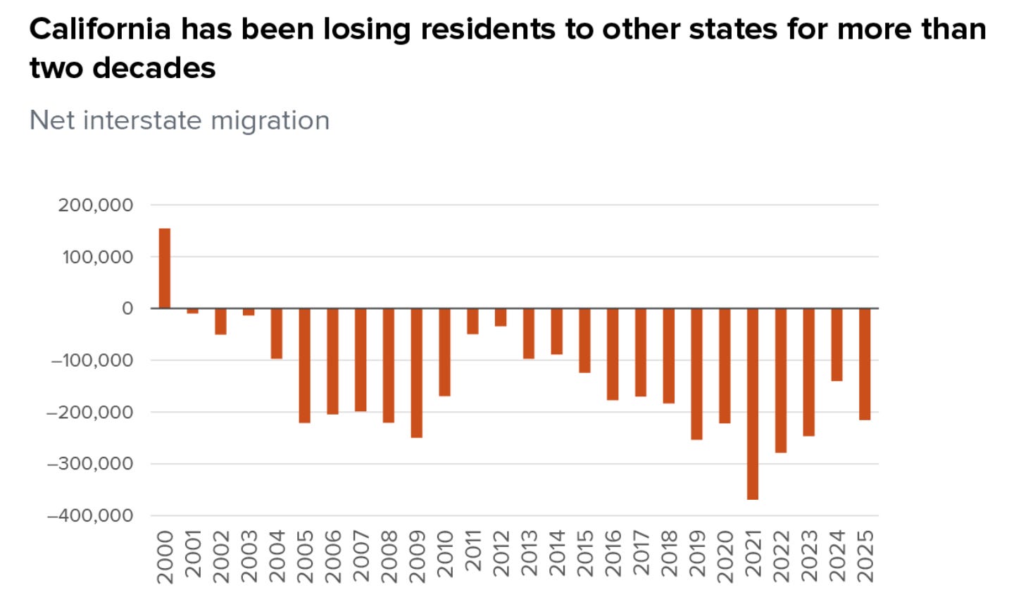 According to PPIC, California lost about 10 million people and gained about 7 million between 2010 and 2024. That’s a net out migration of about 3 million people and at least half of those have been since Newsom became Governor.