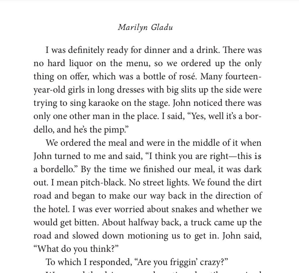 I was spending the morning enjoying the nice weather on the patio when the news broke, so I just soaked up more sun and posted excerpts from her weird, self-published memoir from 2020 called Tales of the Globe Trot. I’ll post those excerpts below, but suffice to say it is a weird book with tales of hanging out in a Thai bordello with 14 year-old prostitutes, her tale of being enthralled with meeting a “burly black man” with really white teeth, her comments about her friend’s 17 year-old daughter “with curves in all the right places,” her admission of driving drunk and more.