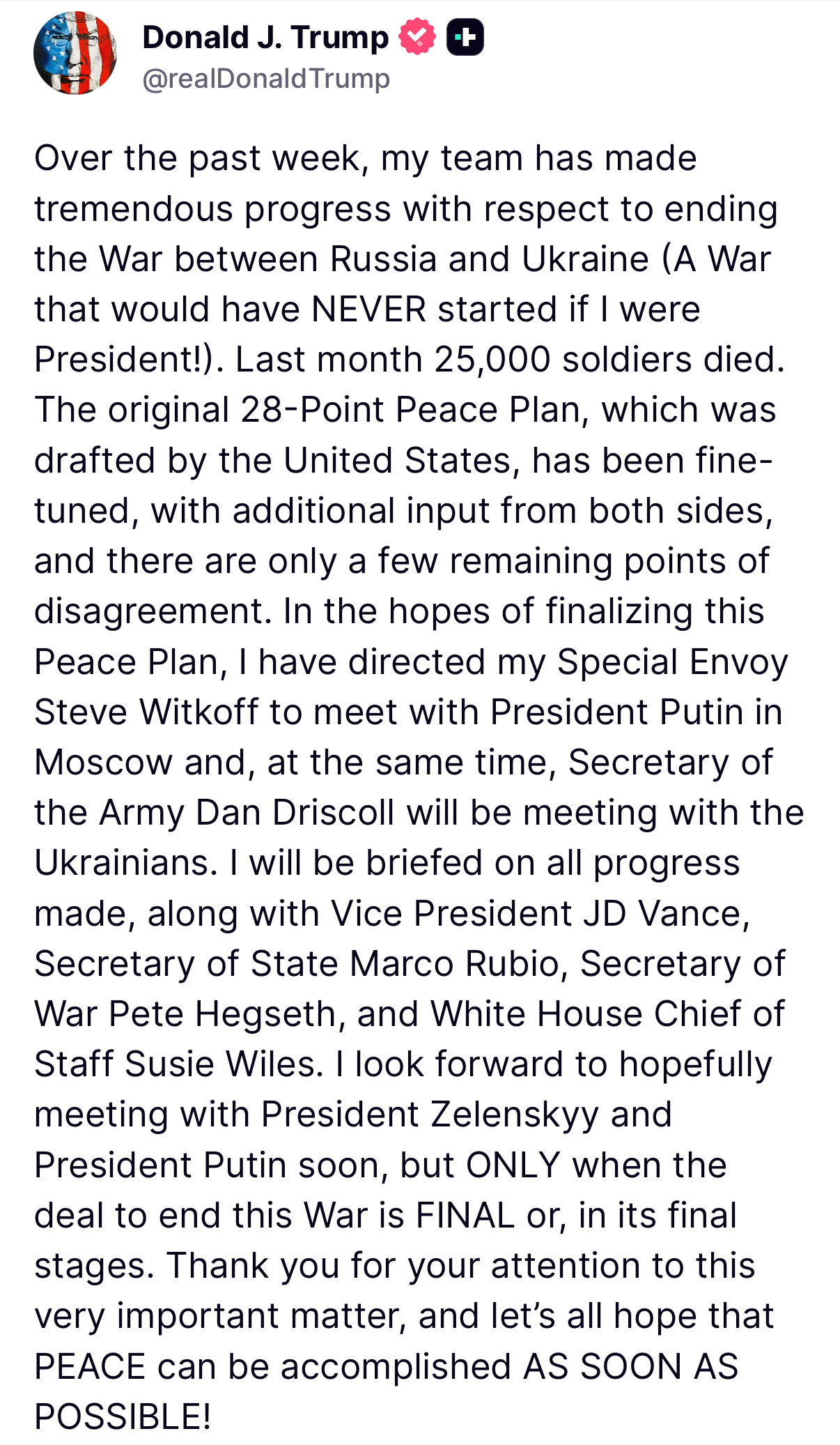 Early Tuesday, Ukraine said they would accept the peace deal, with some changes that Trump is now posting about. I await to see what the Ukrainians say in coming days.