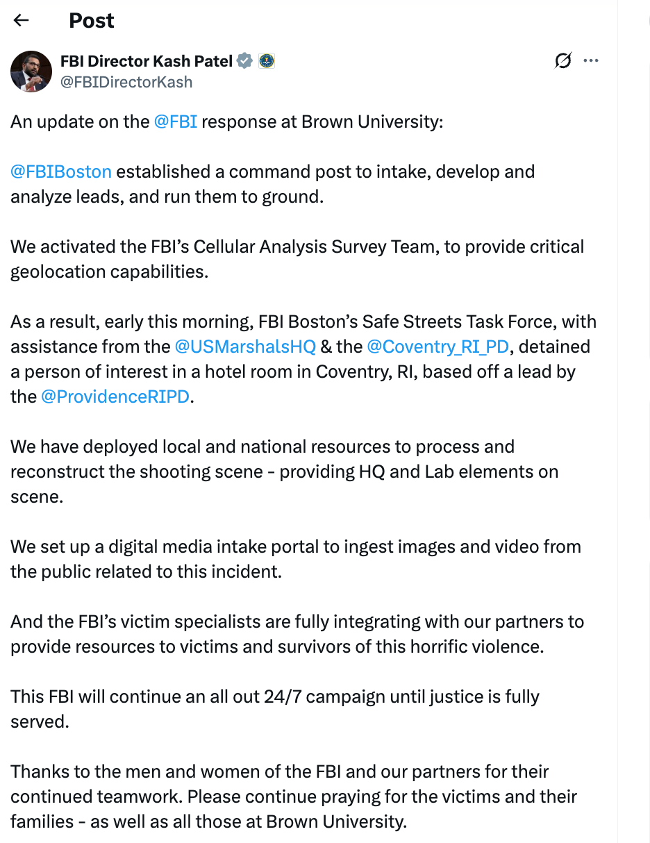 Rhode Island Police Chief Oscar Perez wouldn’t even confirm facts that FBI Director Kash Patel had put out earlier that day. Including that the suspect, sorry person of interest who was detained, was found in a local hotel room after tips and hard work by police and FBI officials.