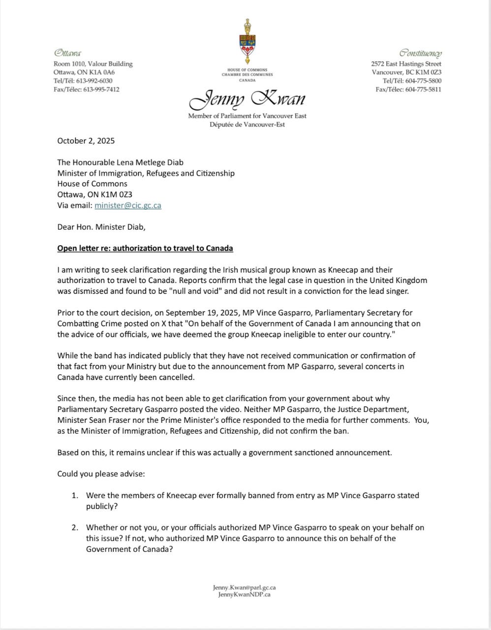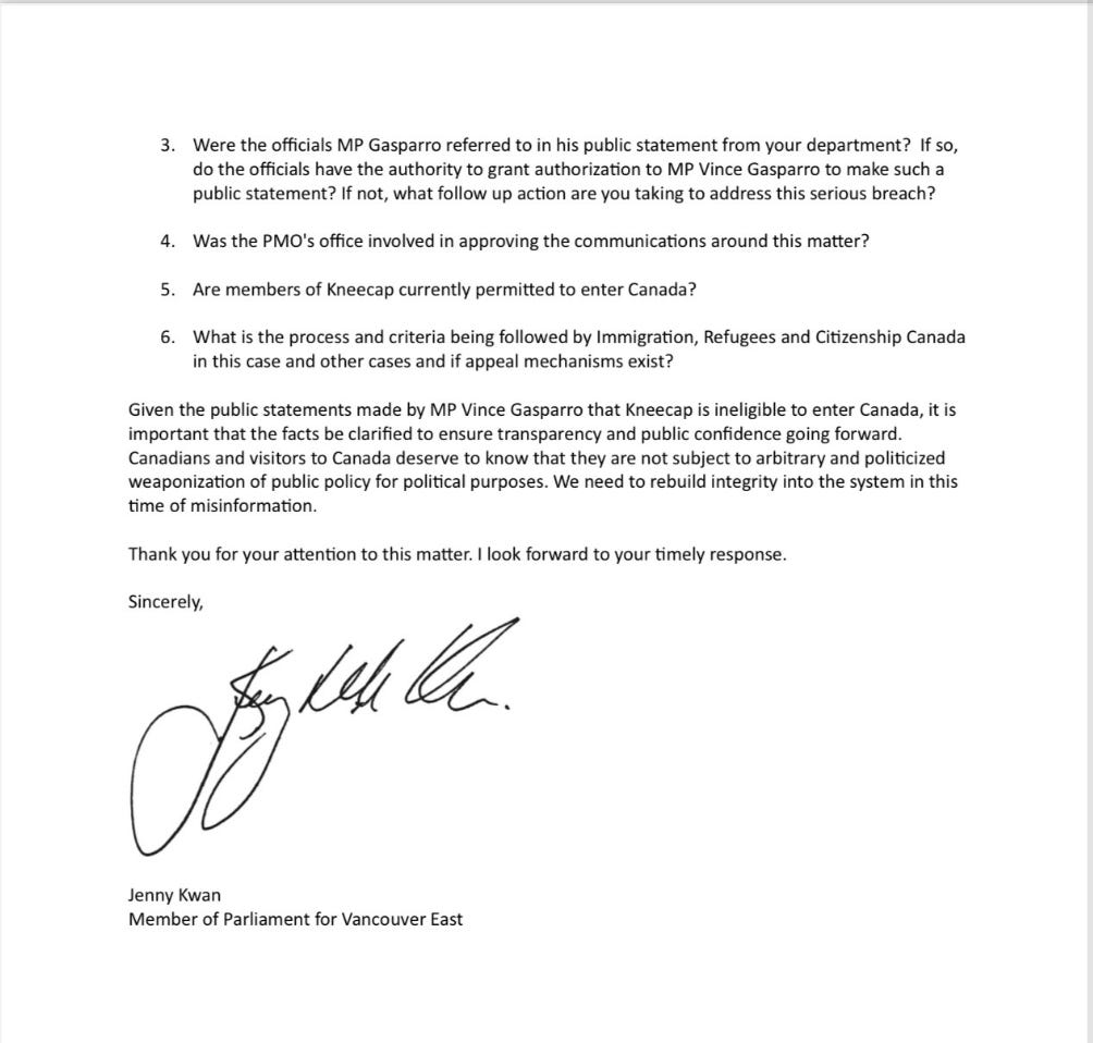 After that, Kwan took to X directly calling Gasaparro a rogue MP and releasing a letter sent to Immigration Minister Lena Diab.