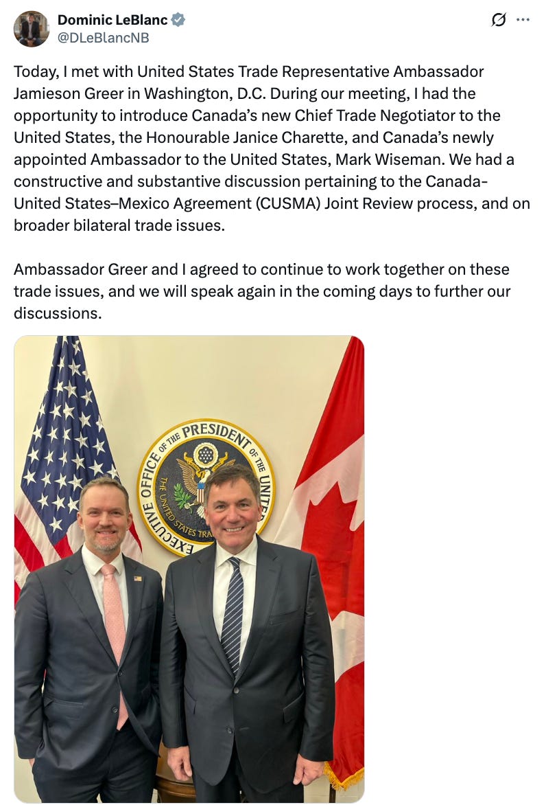 We’ve got Mark Carney in Tokyo, Pierre Poilievre in Berlin and Dominic LeBlanc in Washington. The first two visits listed are nice, but it’s the one in Washington that really matters right now.