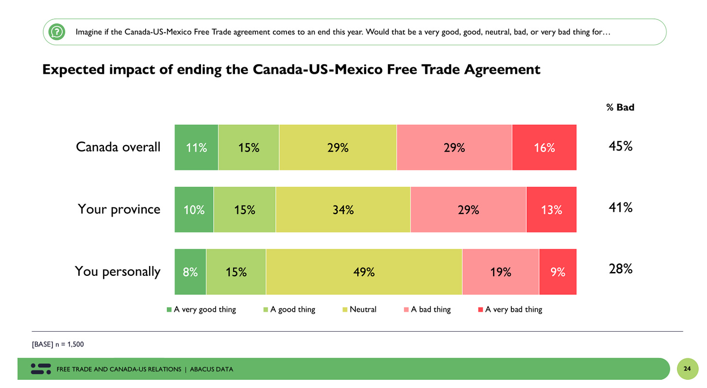 Just 45% say ending CUSMA would be a bad thing for Canada, 26% say it would be a good thing for the country and 29% were neutral.