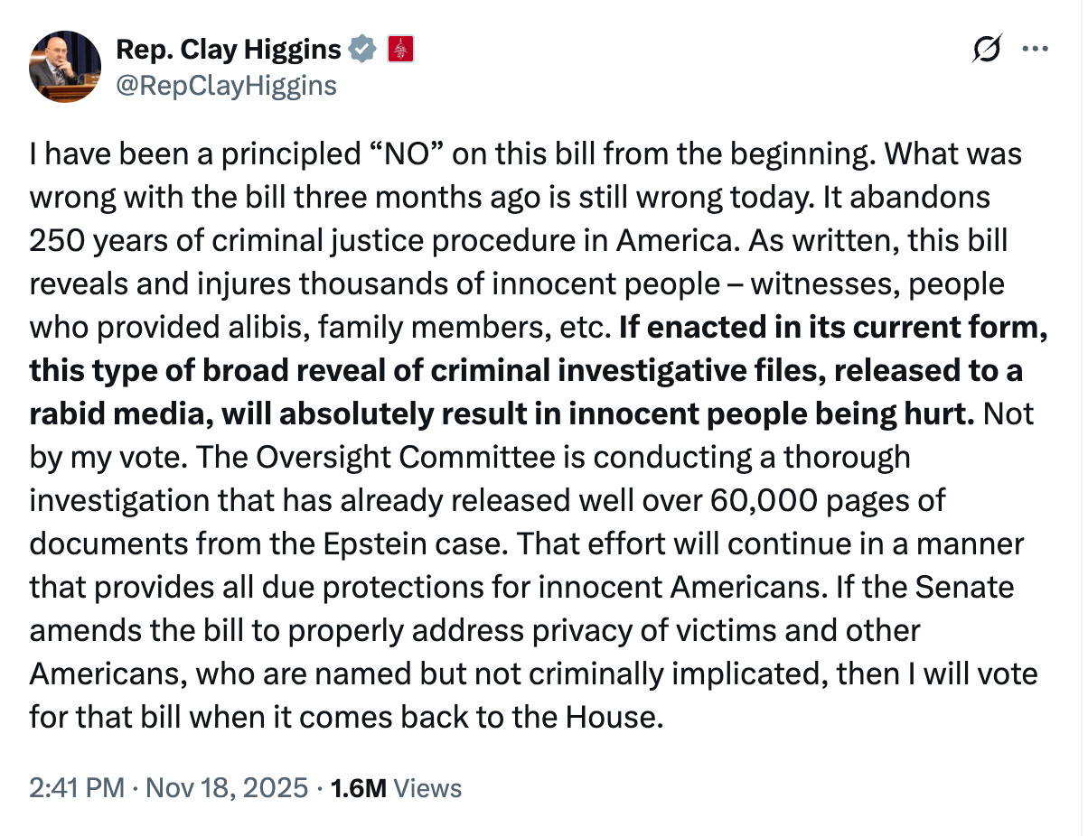 The answer is Representative Clay Higgins of Louisiana, a Republican and no, he didn’t vote no to protect Epstein, it’s about the victims he says.