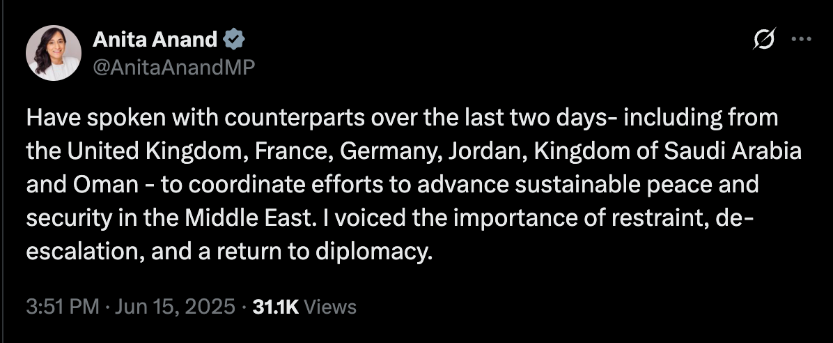 That was the view from Mark Carney’s foreign minister, Anita Anand, on Friday. Sadly, it was still her viewpoint on Sunday afternoon as she posted to X that she had been speaking to counterparts in other countries.