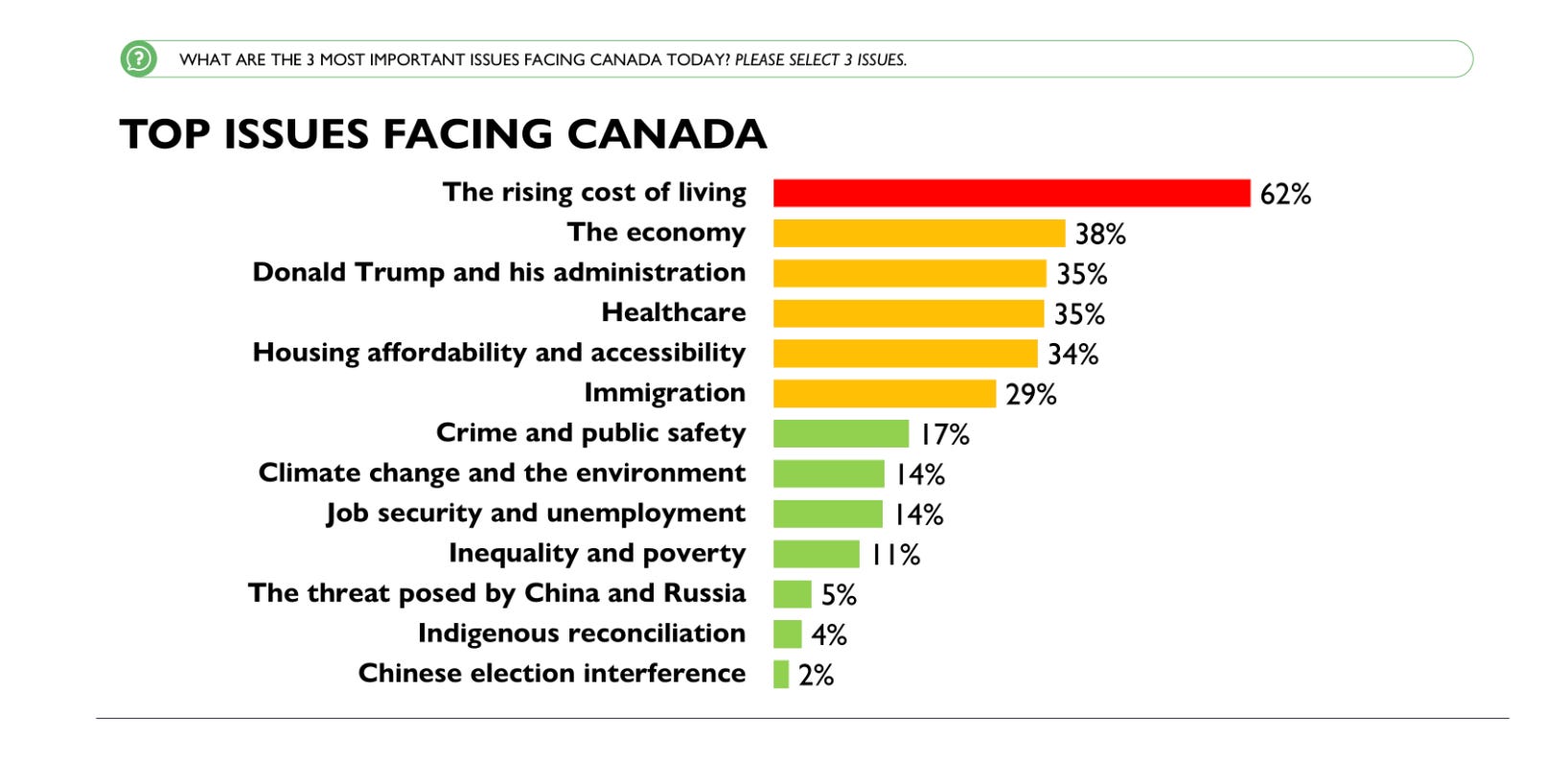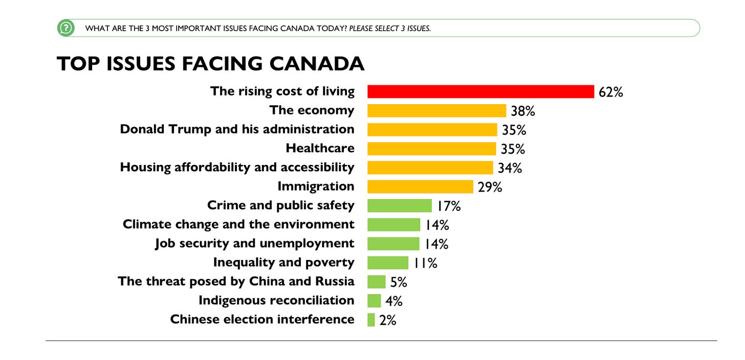 What’s also interesting is that while Canadians generally give Carney and his team decent marks for handling Trump, that’s not the biggest issue. Once again, when asked to rank their three biggest issues, Canadians listed the cost of living as the number one issue, followed by the economy second while Trump was tied for third with healthcare.