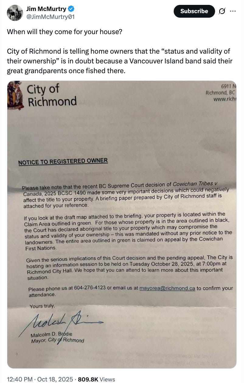 “The court has declared Aboriginal title to your property which may compromise the status and validity of your ownership – this was mandated without any prior notice to the landowners,” a letter sent to homeowners in the area impacted reads.