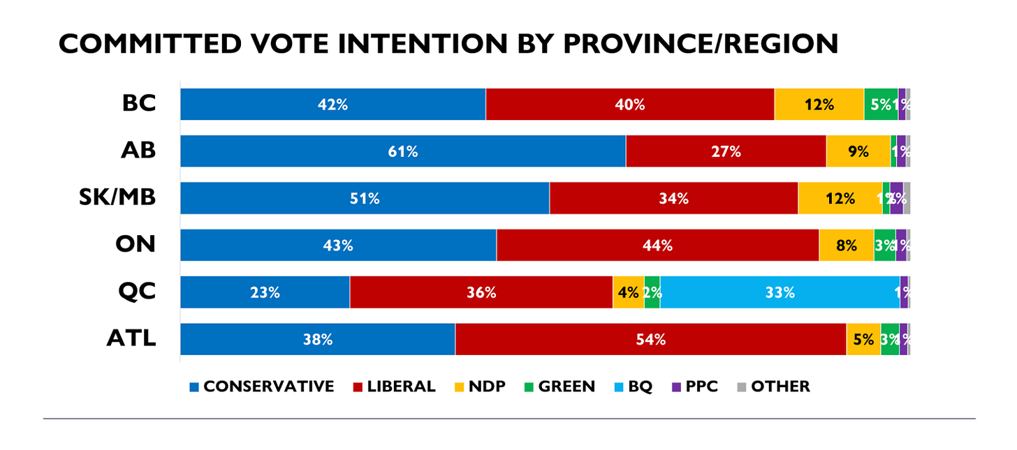 Despite most headlines about Poilievre being negative, the latest Abacus Data poll put his Conservative Party at 41% nationally, the Liberals at 40% and the NDP at 8%. What is interesting is the regional breakdown which includes the Conservatives and Liberals statistically tied in Ontario.