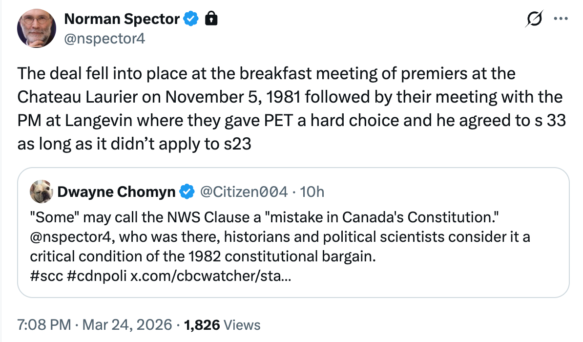 On the other side is the Attorney General of Canada arguing for the court to intervene and remake the Charter from the bench. Sure, it takes seven provinces with more than 50% of the population to amend the constitution if politicians want to do it, but the Carney Liberals are hoping they can get their changes with just four of the seven judges hearing this case.